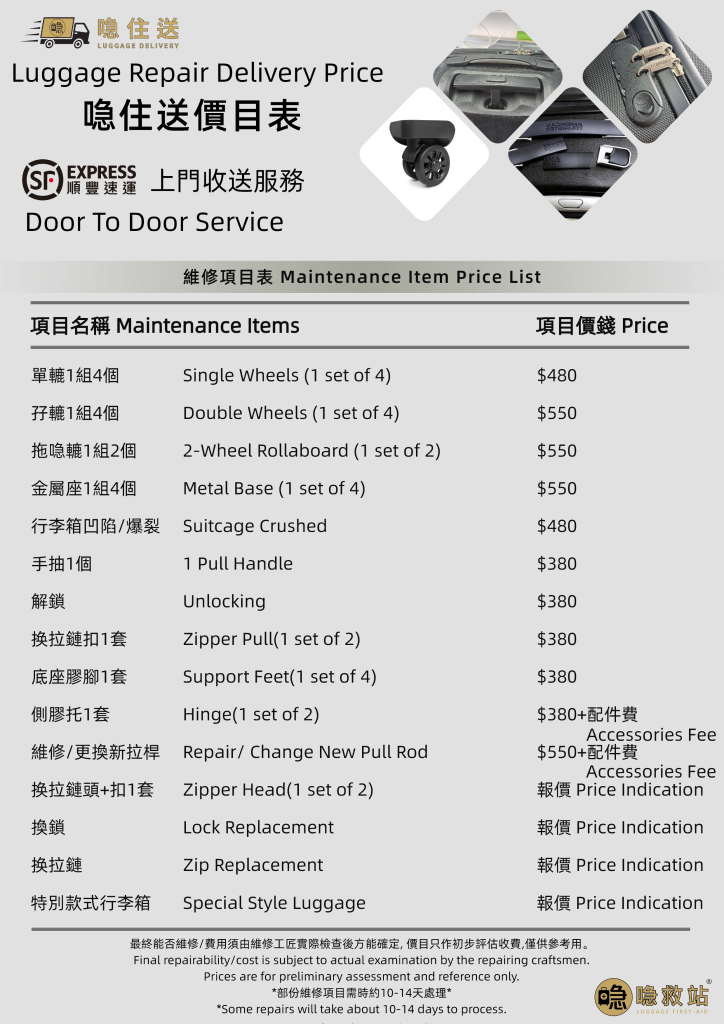 我們亦向客人提供服務保證,可以放心安心將行李喼交給我們修理。
