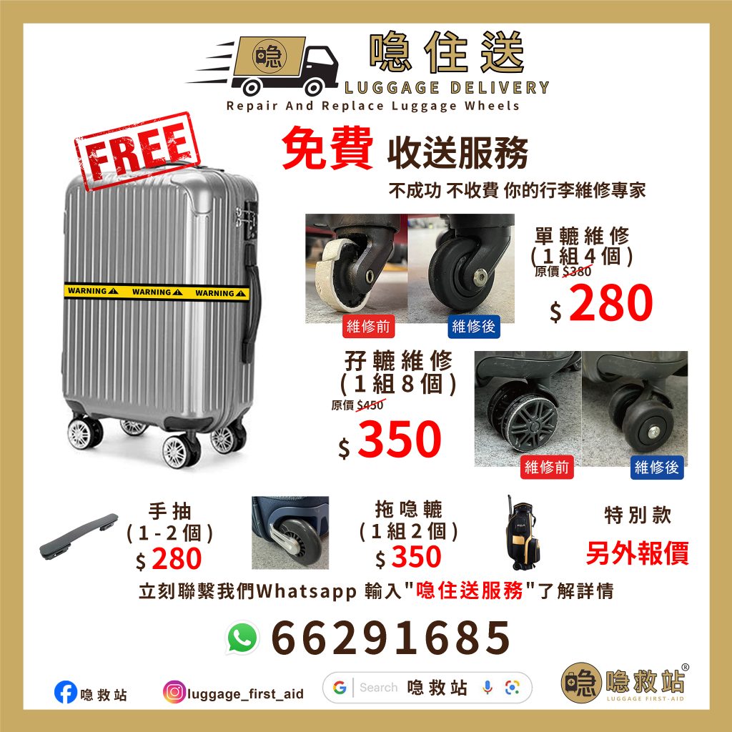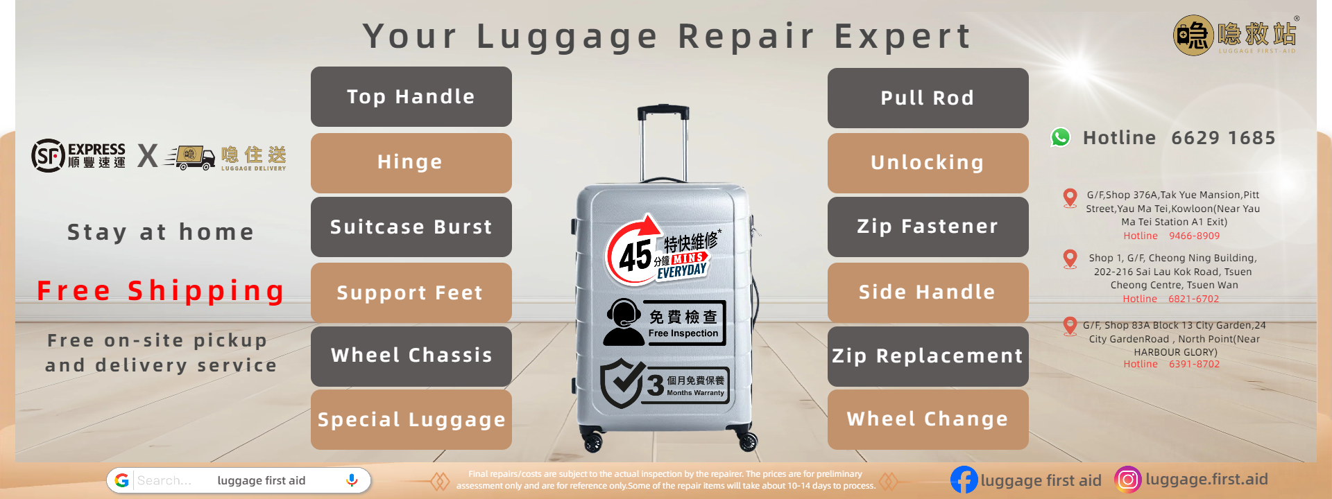 We will arrange professional repair specialist for the service. You only need to bring the luggage to the shop at reserved time slot.