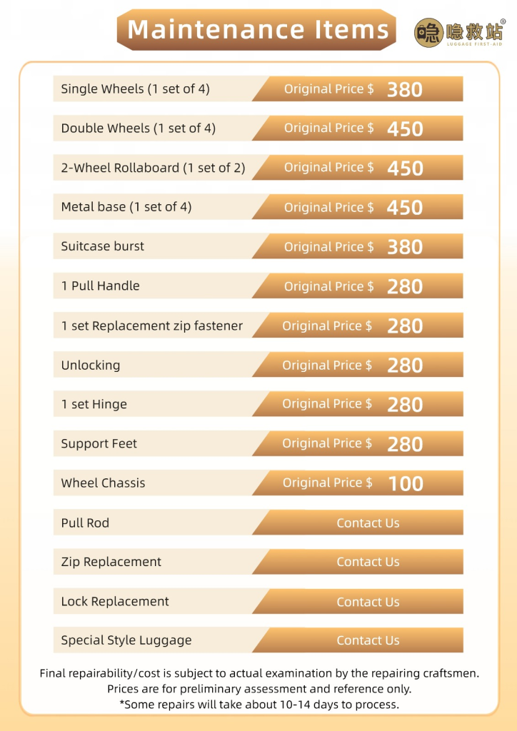 Express Repair (+$50) lasts for 30 minutes or less. Availability depends on the demand at a particular shop and the condition of the luggage that requires fixing (For more info, enquire our customer service representative via WhatsApp) - Please bring the luggage to shop. After repair, our logistic team will deliver the luggage to your address (delivery fee from $20). You can also collect the luggage at shop. Additional price may be charged for movable metal seat removal/ repair service.